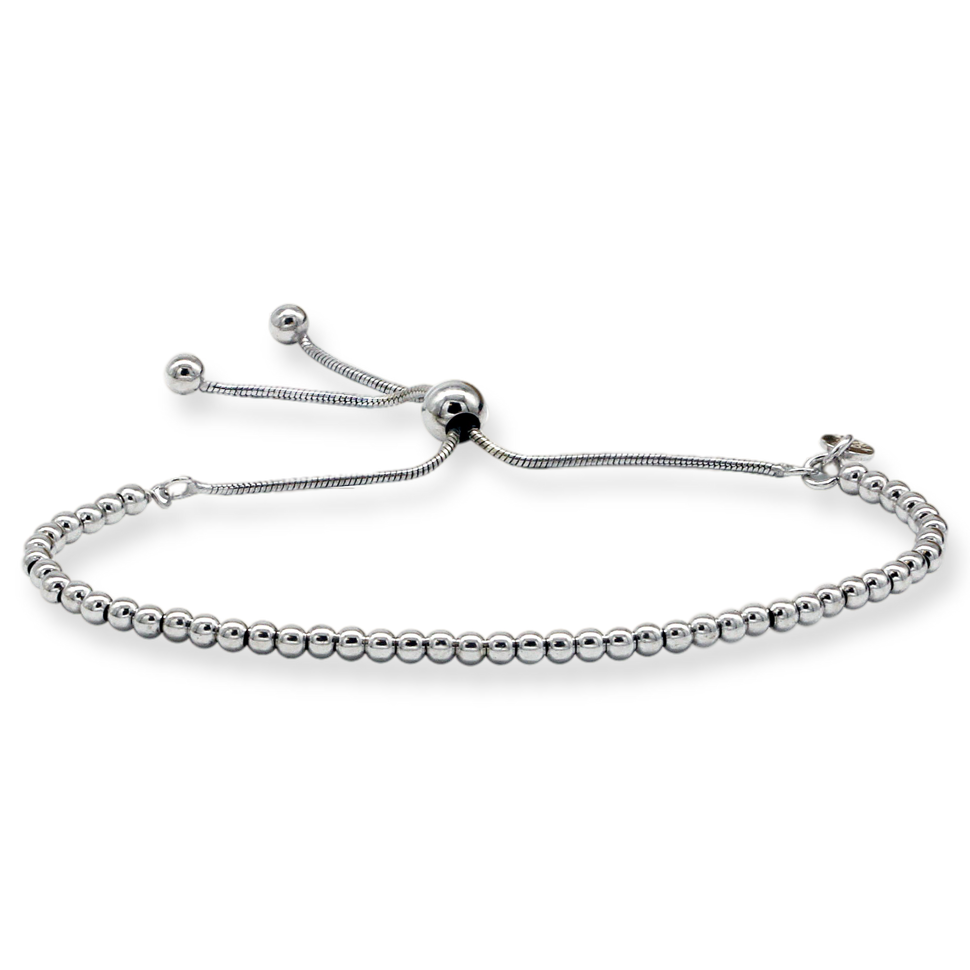 Simply elegant, classic polished beads on a flexible snake chain. Crafted from fine Italian sterling silver with rhodium, this bolo-style bracelet is fully adjustable with a sliding Smart Bead from 7 to 11 inches.